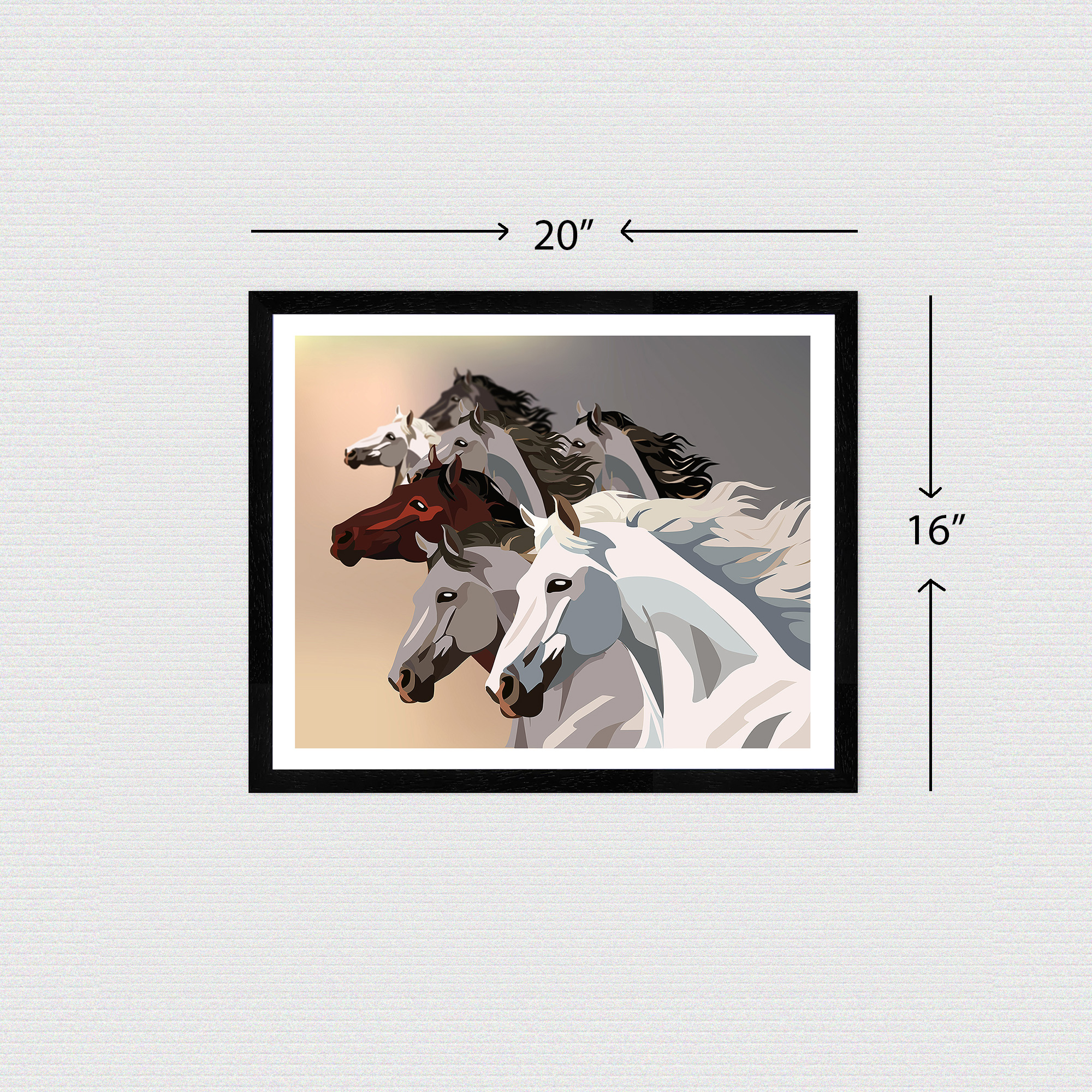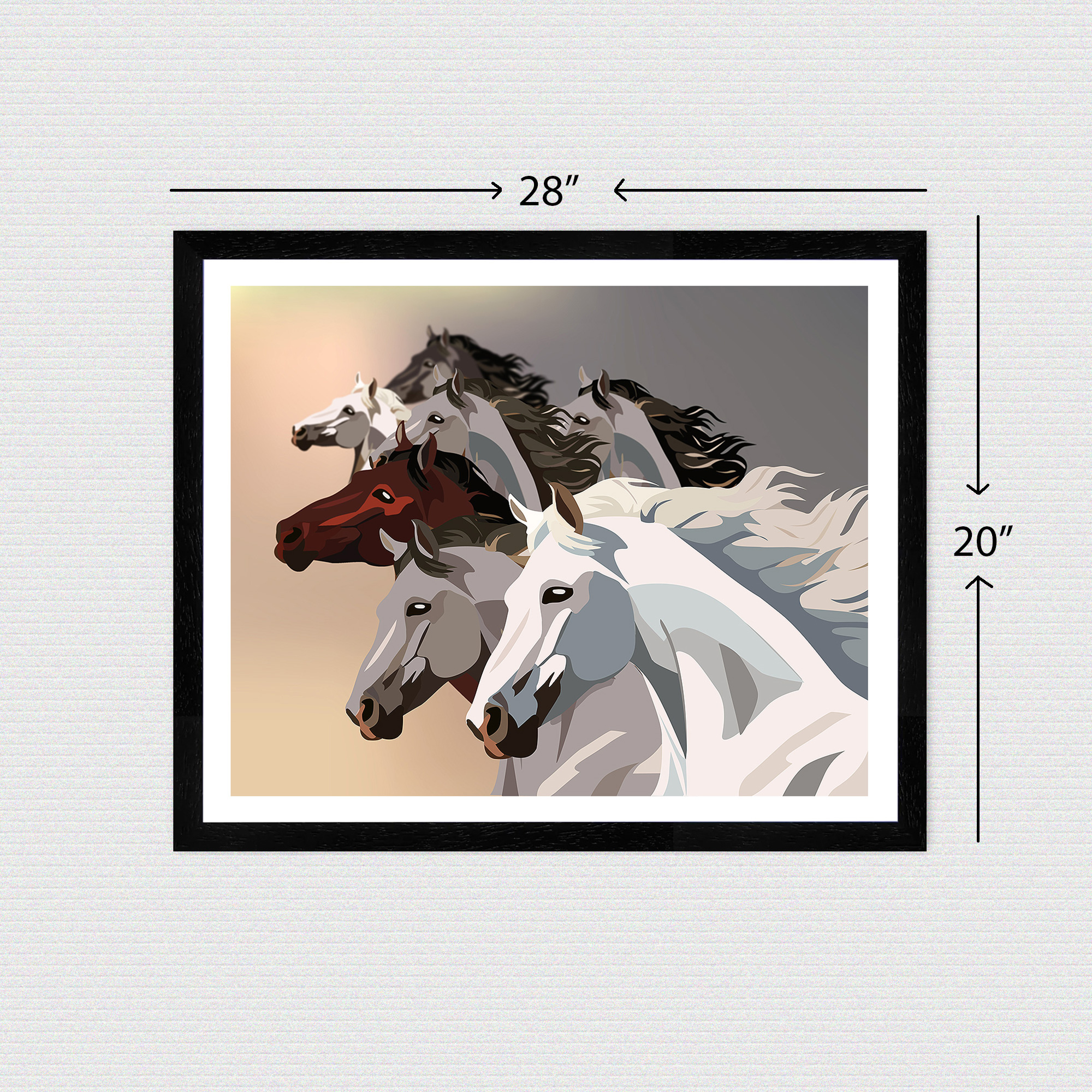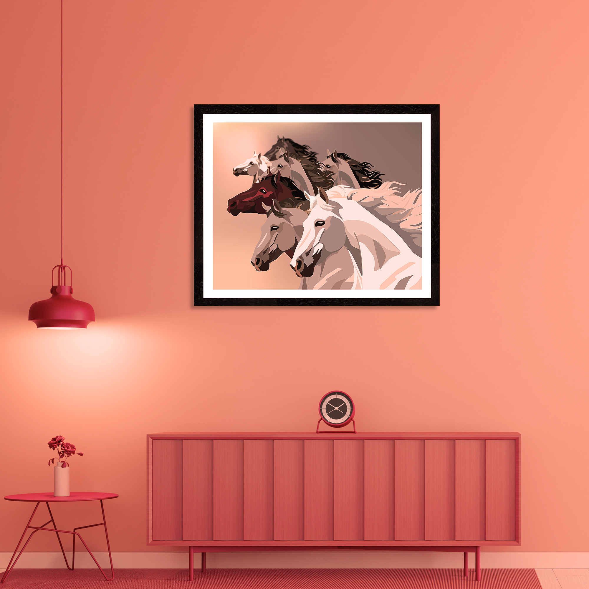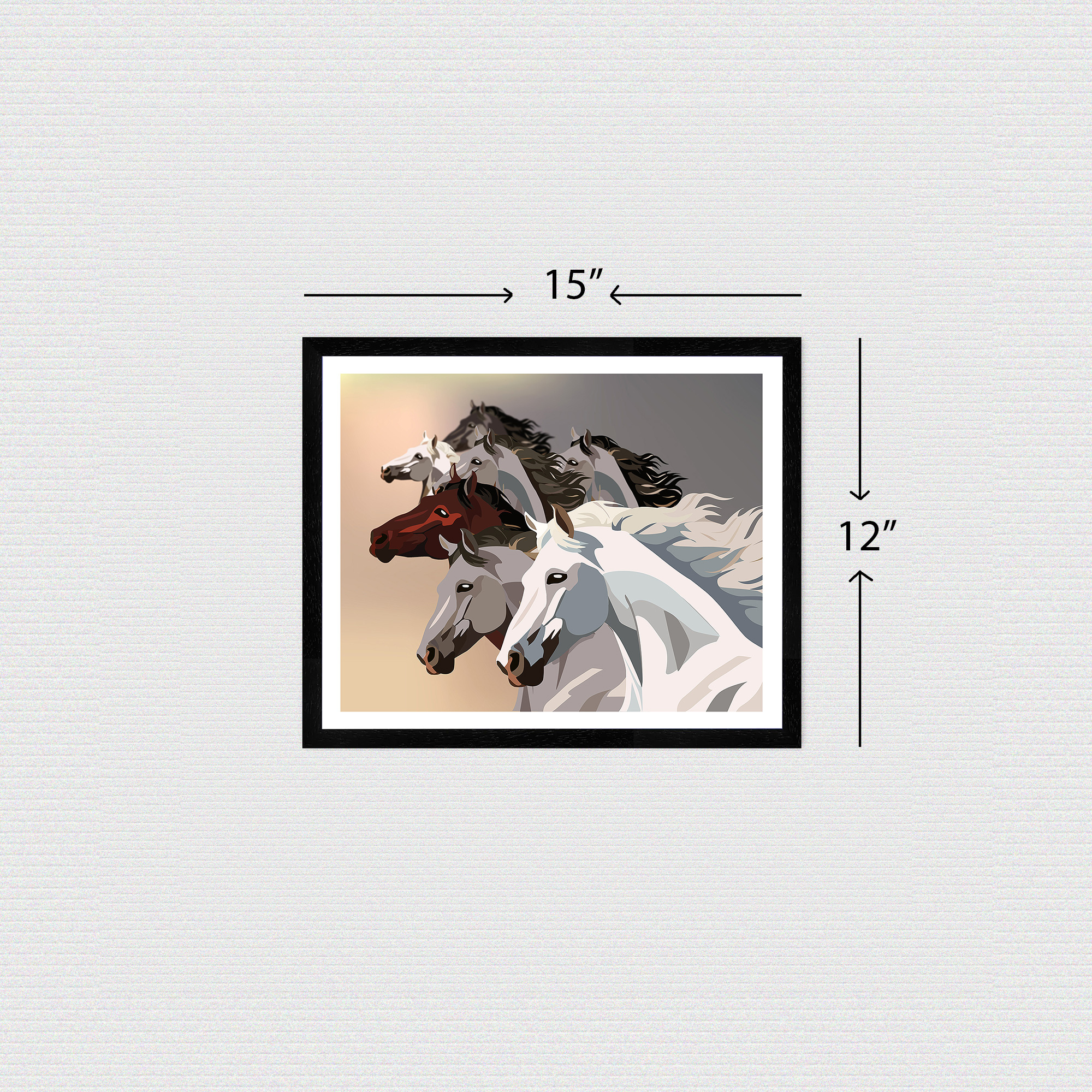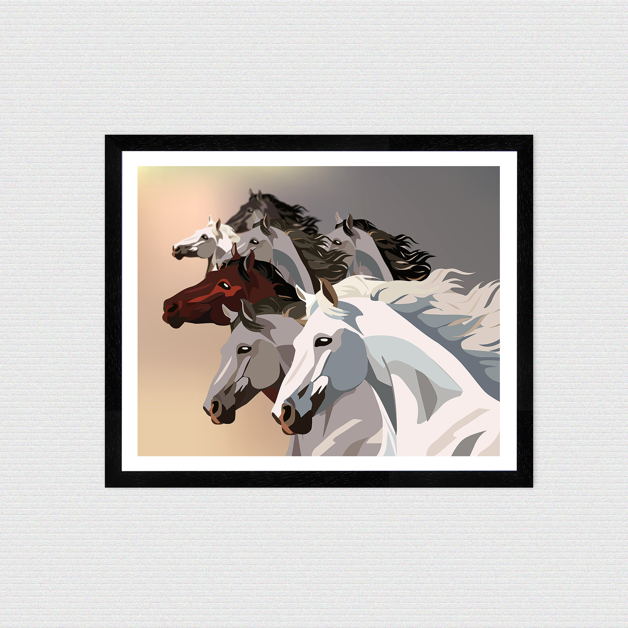 This elegant wall poster features seven galloping horses, a symbol of power, success, and positivity in Vastu Shastra. The seven horses represent energy, progress, and speed, bringing prosperity and balance to any space. Ideal for home or office walls, this artwork enhances motivation, removes obstacles, and promotes continuous growth. Printed in premium quality with a matte finish and framed to perfection, it adds both aesthetic charm and auspicious energy to your interiors.